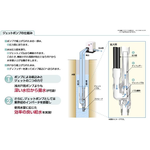 深いところの地下水を吸い上げるには大きな力が必要になるため、ジェットで吸い上げを補助して効率を高めています。